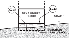 9 Subgrade Crawlspace The floor above the crawlspace is raised above ground by any method, but the crawlspace floor sits below the surrounding grade on all sides, like a basement. Subgrade crawlspaces must conform to the 2-foot/5-foot rule (see below).