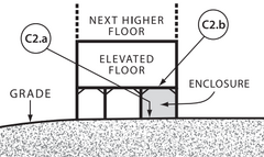 5 Elevated without Enclosure The area below the elevated floor is open, with no obstruction to the flow of floodwaters. Open lattice and insect screening is permissible. "Pier and beam" foundations.